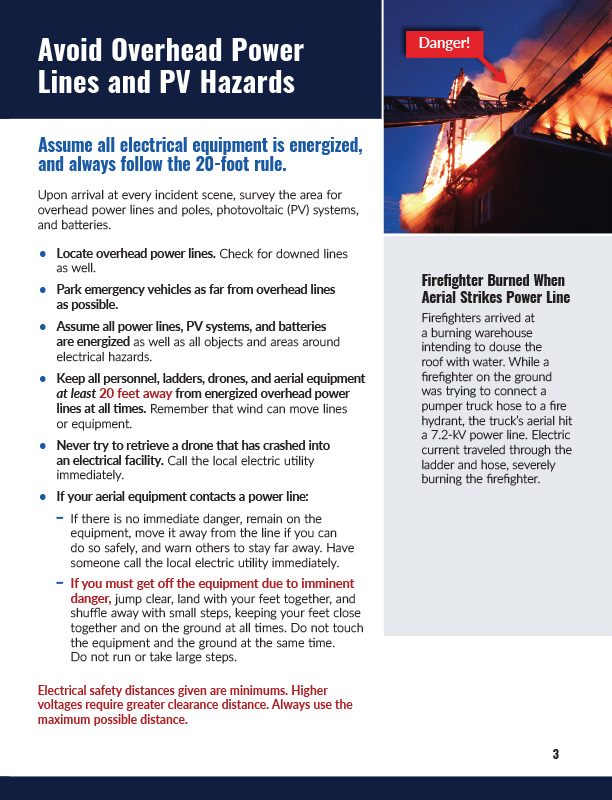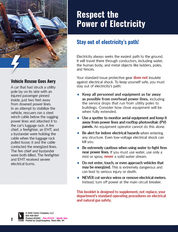 Firefighters, police, and EMTs are often the first on the scene in an emergency and face the greatest risk from electrical and natural gas hazards. This booklet provides crystal-clear steps for responding to incidents. It tells how to check for hazards every time, presents real case studies to learn from, and explains the importance of calling the local utility for help. There’s space for your utility’s emergency contact info under your logo.