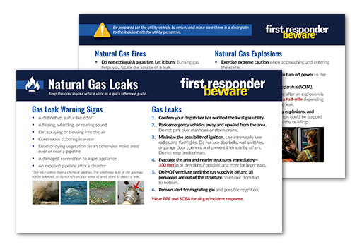 When first responders face a natural gas hazard or emergency on the scene, they can pull out this hand visor card that tells them what to do to keep themselves and others safe. The two-sided card covers natural gas related fires, natural gas explosions, and natural gas leak warning signs. First responders have to make fast decisions under pressure; make it easy for them to protect people by providing a visor card that recaps important natural gas safety basics.